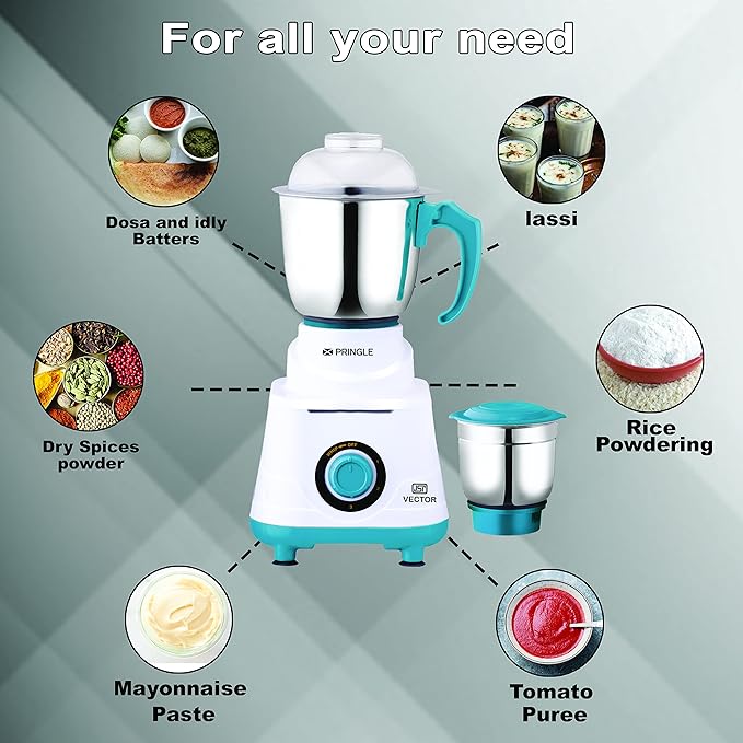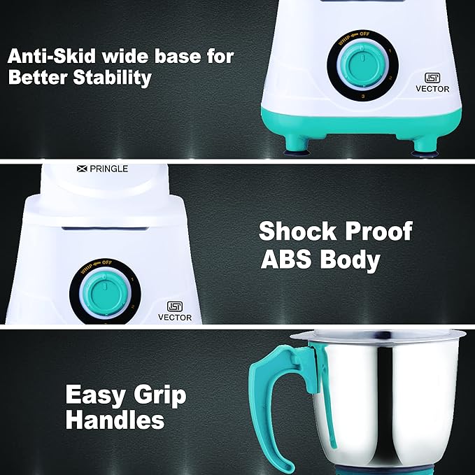 - Pringle Vector Blades and Multi-purpose Jars: Pringle Vector blades are uniquely engineered to allow for uniform and efficient grinding. They are long-lasting and manufactured of high-quality stainless steel. The Pringle Vector includes a 1.5L SS Liquidizer Jar, a 1L SS Multi-Purpose Jar, and a 0.4L SS Chutney Jar.