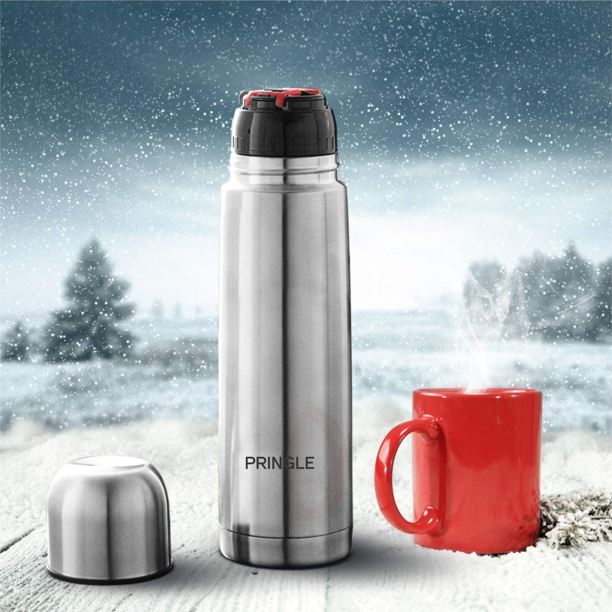 Pringle brings a 500 ml water bottle for office and school purposes. It has Double-walled Vacuum-insulated technology that keeps beverages hot or cold for 24 hours. It comes with a bag and belt for easy carrying. This reusable water bottle is made from 304-grade stainless steel, leakproof, durable, unbreakable, rust proof.