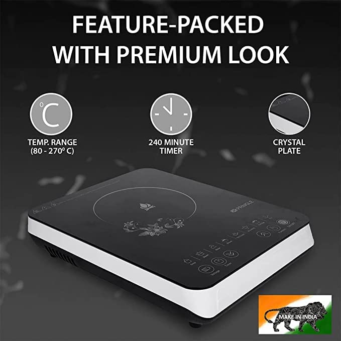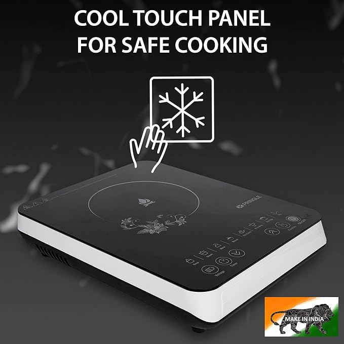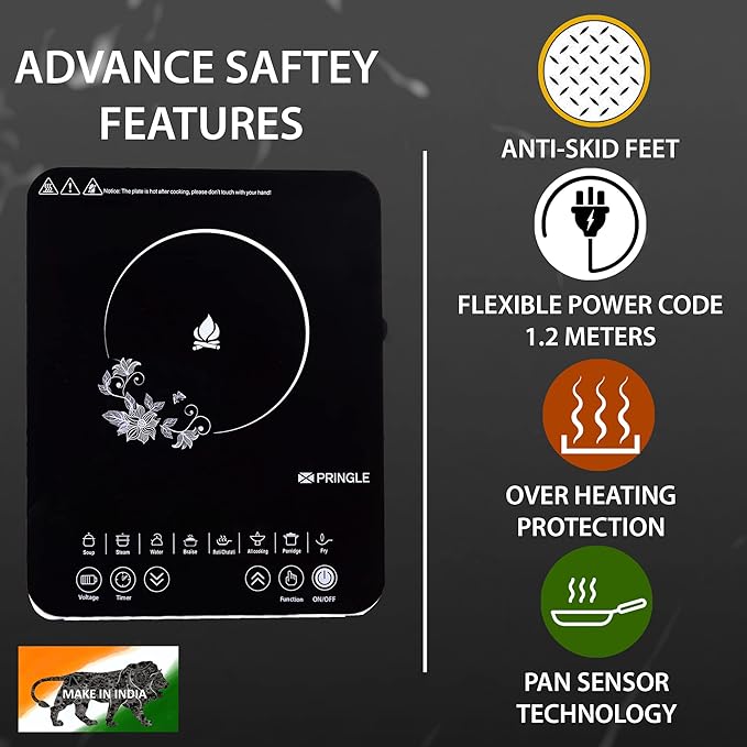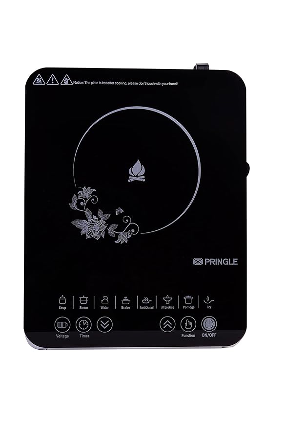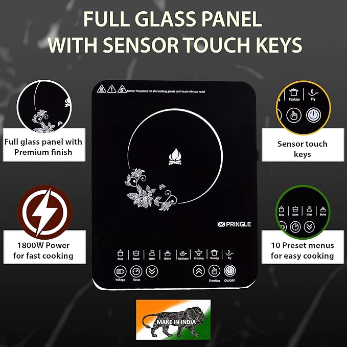 | Smart sensor touch control for easy operation 1800 wattage enables faster cooking & 4x energy saving versus traditional cooking. | Auto switch to power saving mode with 8 PRESET function settings The Timer Function and Pause Function make cooking with pringle IC 10 effortless. | Crystal glass plates give your kitchen an upscale, sophisticated appearance that is comfortable and simple to clean. ISI certified and proudly made in INDIA. . |