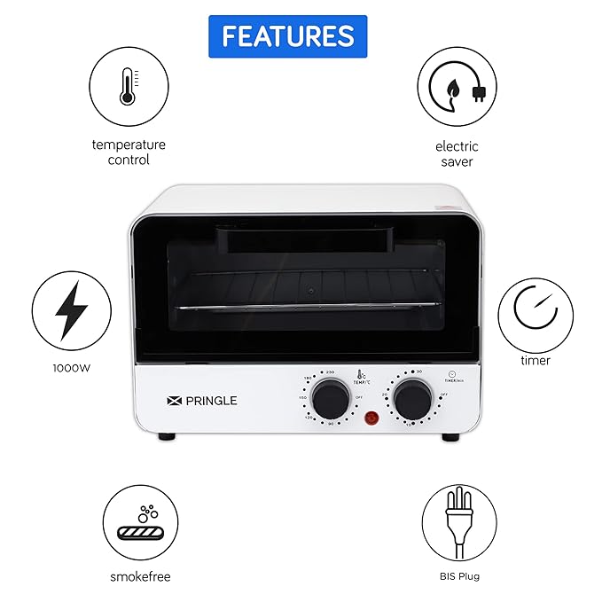 Auto-shut off timer function with ready bell to prevent over-cooking and under-cooking Heat-resistant tempered glass window can withstand high temperature & is safe to use Removable crumb tray for easy cleaning Inside lamp for clear visibility throughout the cooking process. deal convection mode for faster, uniform cooking & browning High temperature control range up to 250 degrees to cook any dish Open your kitchen to a whole new world of quick, easy and smart cooking like a Masterchef every day! Cooking capability: Baking, Grilling, Toasting; Heat-resistant tempered glass window. Heating element selector: top, bottom, sides pringle products are inspired by Italian Design and adhere to German Quality Standards. They are covered by Reliable pringle.