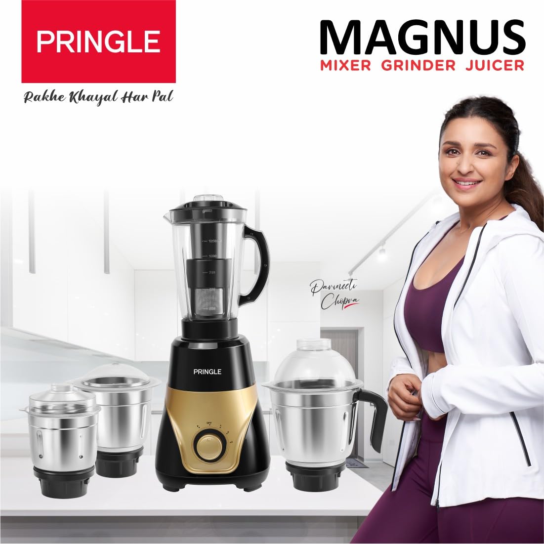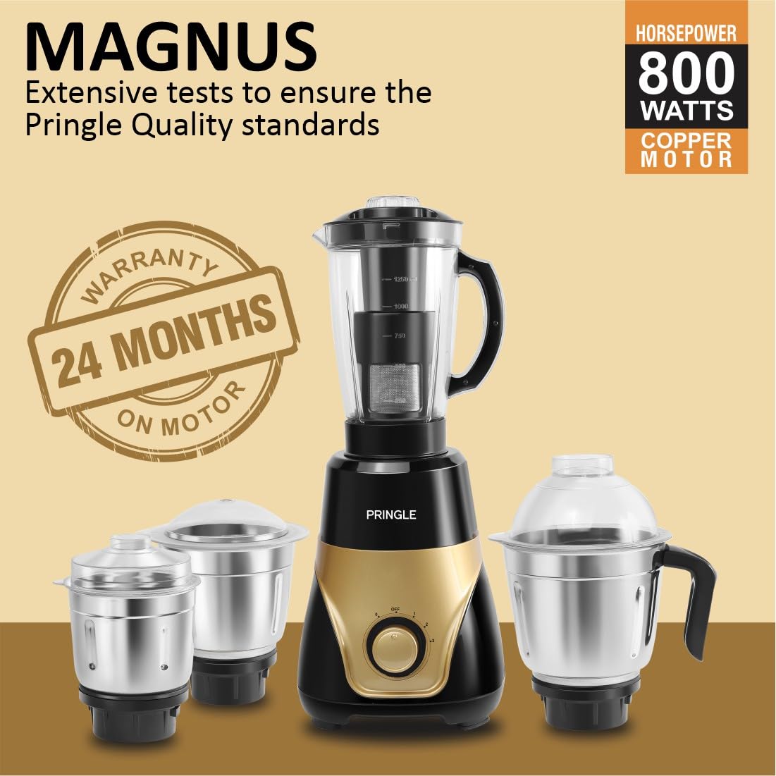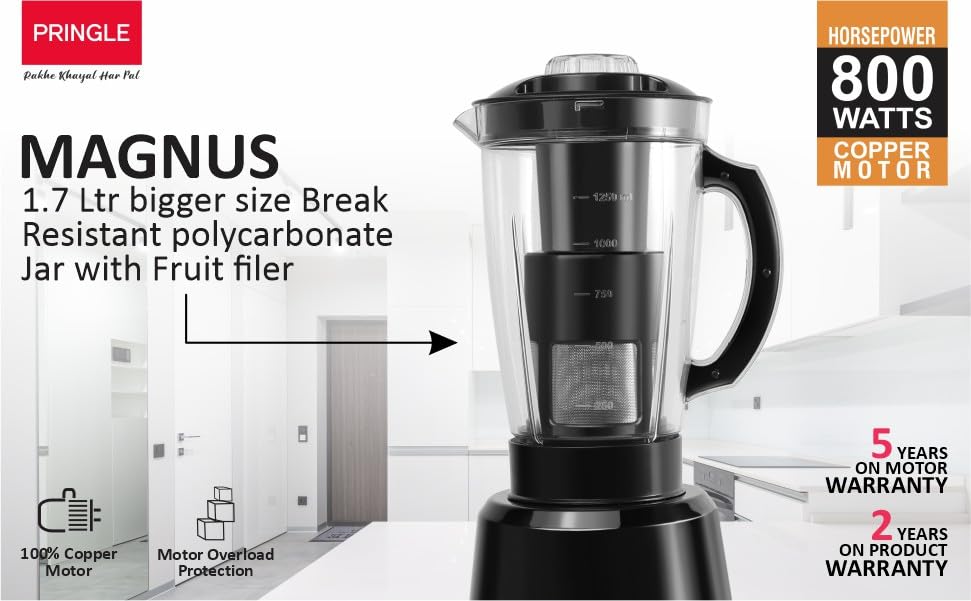 Pringle Brings Magnus 4 Jar Mixer Grinder 800W Powerful Copper Motor[ISI] Certified- With Ergonomic Design Pringle mixer grinder is aesthetically designed high grade plastic body and the jars are made with stainless steel that ensures durability while adding elegance to your kitchen 3 Speed With Pulse Operation The speed regulating knob is a smart feature which serves your purpose of adjusting varying speed limits. Now, you can take control over your kitchen by regulating the grinding or mixing process of your food items with the speed regulating option coming in handy