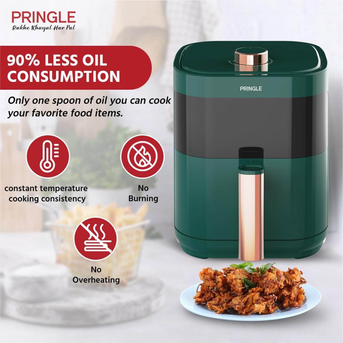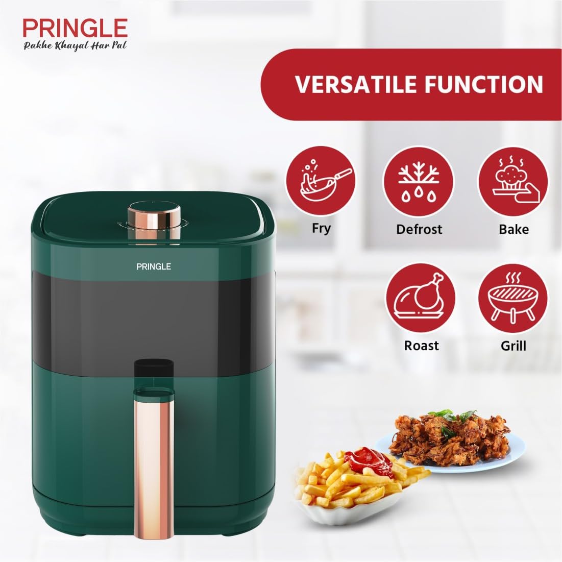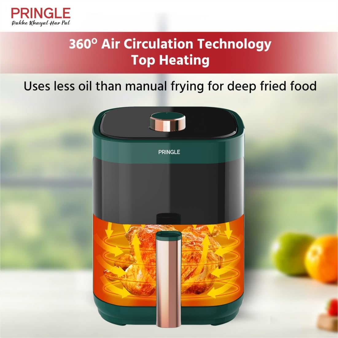 Pringle brings to you the healthiest way to fry, bake & grill! Little or no oil is needed for the Pringle Air Fryer with a large capacity of 3.2 Litres, to ensure perfect texture and delicious results! It has a cooking system that comes with the high-speed circulation of hot air at a constant temperature, achieves tasty and crispy fries with 99% less fat since it fries with little to no oil. 360° Air circulation Technology helps to ensure that the food receives consistent heat from all angles, resulting in uniform cooking and a crispy texture on all sides. During cooking, the air fryer's fan will circulate the hot air around the food, cooking it from all angles.