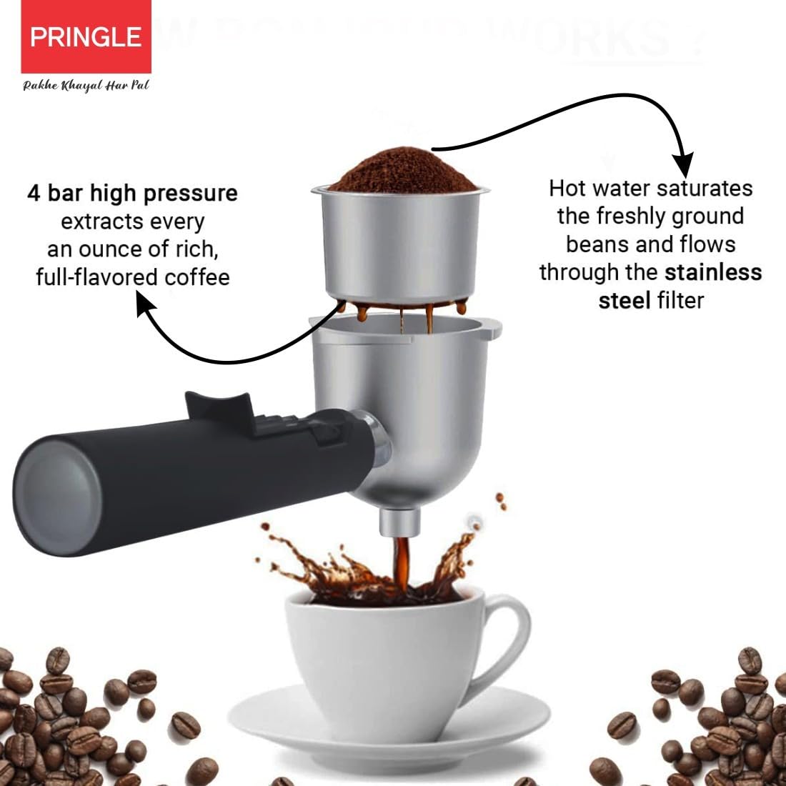 Brew hot coffee in minutes: Want to drink delicious and hot coffee within minutes? Pringle is here. With 850W of power, this coffee machine helps you brew your perfect cup every single time. Say goodbye to long waits!! 3 in 1 coffee maker: Endless possibilities with this coffee maker. With a multi-purpose control knob, make cappuccino, espresso or latte at your convenience. Easy one-go knob for all your different tastes. High-pressure steam bar: This coffee machine gives maximum froths, thanks to its high-pressure steam bar. Pringle releases steam up to 5 Bar Highlights of the coffee maker: Removable drip tray that gets separated easily & is convenient to use. Power Indicator light that indicates the coffee maker has been switched on Excellent for large groups - The 4-cup capacity makes it perfect for large family gatherings. Pringle comes with a fine-quality borosilicate glass jar. Harder and tougher than any other glass. Just what you need for everyday use.