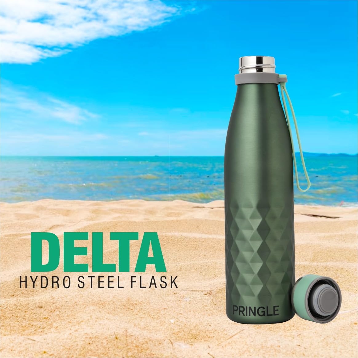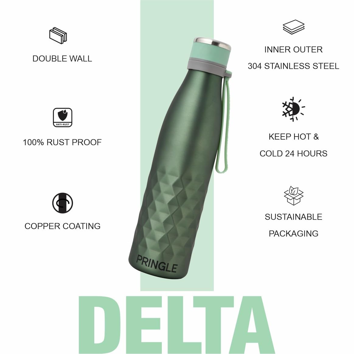 The Pringle Delta 550Ml ml Hydrosteel Bottle is a unique bottle that is ideal for hot and cold beverages. It has a capacity of 550 ml and is made of stainless steel. The bottle features double-walled vacuum insulated technology that keeps beverages hot or cold for 20+ hours. The inner coating ensures better temperature retention. The bottle is leakproof, rustproof, and sweat-free, making it ideal for carrying icy cold water without any condensation on the outer body. It comes with a transparent drinking cup made of plastic which is suitable for tea hot flask.