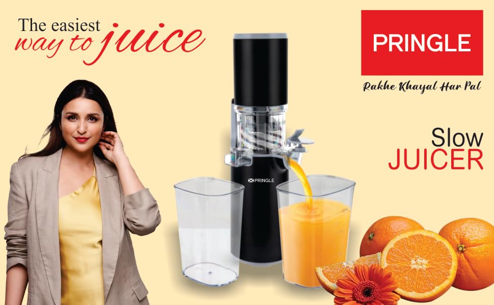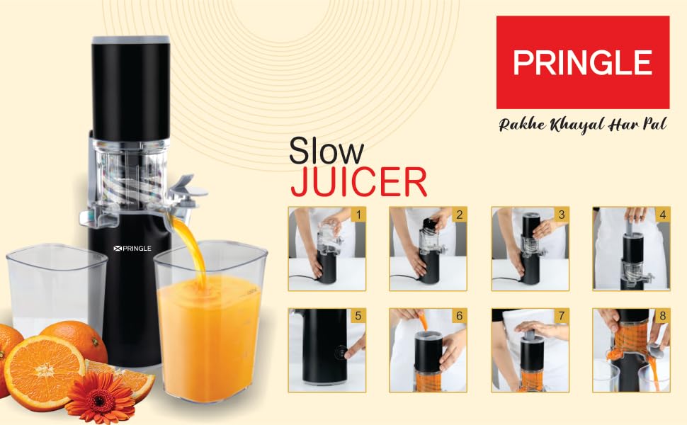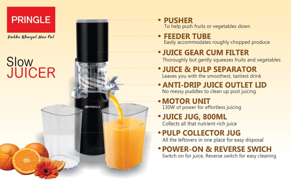 SLOW SPEED EXTRACTION, MAXIMUM NUTRITION - The Pringle Slow Juicer uses low-speed (55 RPM) to squeeze fruits and vegetables ensuring no important fibre, vitamins and minerals are damaged from heat and processing. This kind of juice extraction prevents oxidation and help you get real-tasting and natural juice.