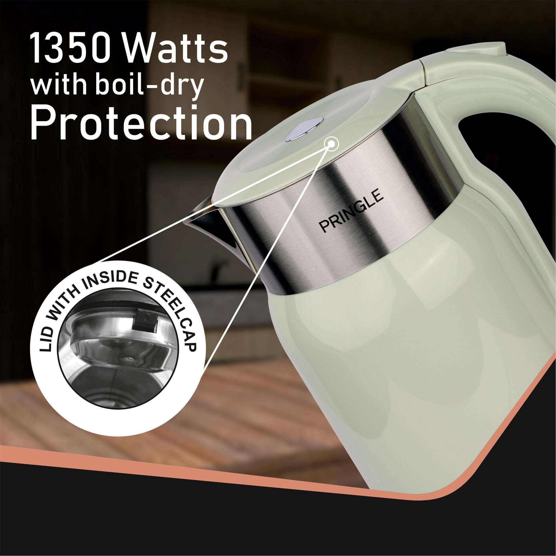 Pringle Haden Electric Kettle Double Wall 1.8L With SS 304-1500W with Keep Warm Function,Boil Dry Protection &Auto-Shut Off| Concealed Heating Element| 360 Deg Cordless Base, (PISTA)